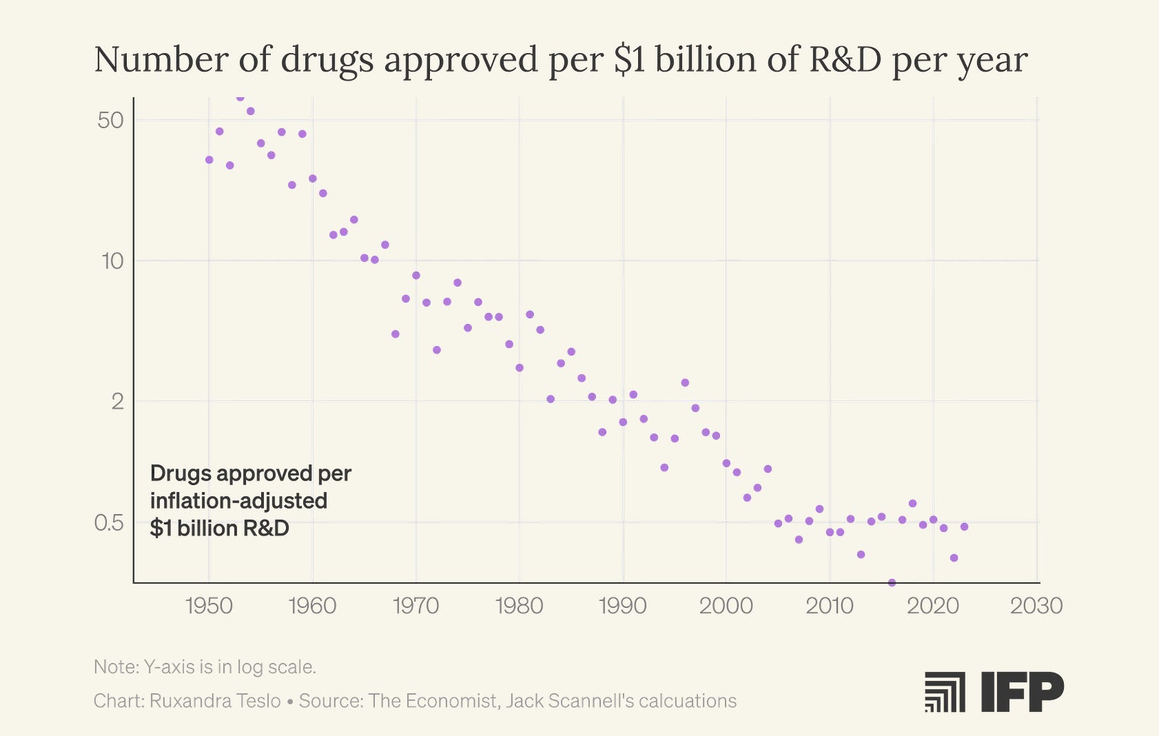 I first encountered Eroom’s Law, the observation that biopharma productivity, measured as new drugs approved per billion dollars of R&D spending, has been steadily declining since the 1960s, halfway through my PhD. The fact that I completed a supposedly world-class undergraduate biology degree without ever hearing about this concept, and then spent another two years in a PhD program before discovering it, now feels damning. If anything deserves a place in Biology 101, it’s the recognition that our ability to turn biological insight into effective medicines has been deteriorating for decades.