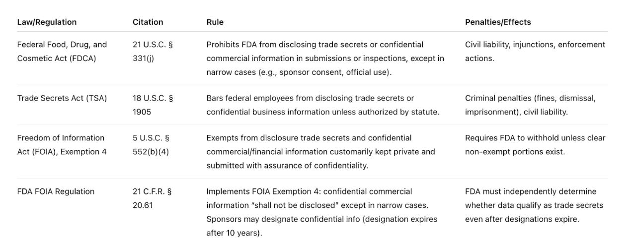 But in reality, none of it is lost. Every interaction with the FDA, every clinical protocol, every amendment and reviewer comment is meticulously documented. All of this information lives inside CTDs (Common Technical Documents) that routinely span thousands of pages. A CTD is not a summary, but a full chronicle of development: preclinical toxicology data, trial design rationales, adverse event logs, detailed manufacturing methods, and the entire back-and-forth between sponsor and regulator. To outside observers, this record is invisible. To those who have seen one, it is immediately clear that CTDs are the most comprehensive archives of real-world clinical development practice ever assembled. However, this information is very hard to access. Bound by statutory law, the FDA treats most of it as confidential, especially anything seen as a trade secret or business-sensitive. In practice, this results in heavily redacted FOIA releases that lack the technical detail that drug developers would require.