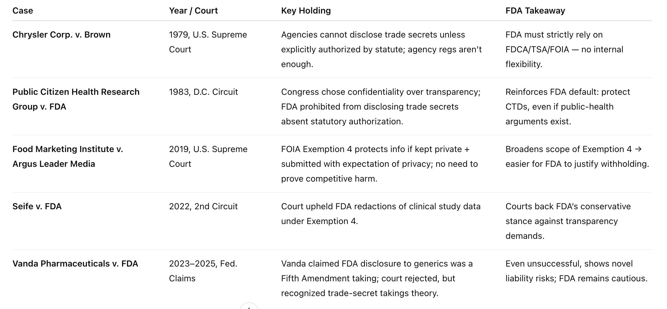A case that shows just how strict the current legal environment is Vanda vs FDA (2023-2025). In May 2023, Vanda Pharmaceuticals sued the FDA in the U.S. Court of Federal Claims, alleging that the agency improperly disclosed confidential trade-secret information related to its drugs Fanapt and Hetlioz to generic drug applicants. Vanda argued that dissolution specifications and manufacturing details were revealed. The company framed its complaint as a Fifth Amendment “takings” claim, saying the government had taken proprietary information without compensation. By January 2024, the court allowed the takings claim to move forward but dismissed the implied contract claim, meaning it found no contractual duty breached by the FDA. In January 2025, the court ruled against Vanda, finding that much of the information in question was not originally developed by Vanda but was instead proposed or suggested by the FDA itself. As a result, it was not considered a protected trade secret belonging to Vanda.