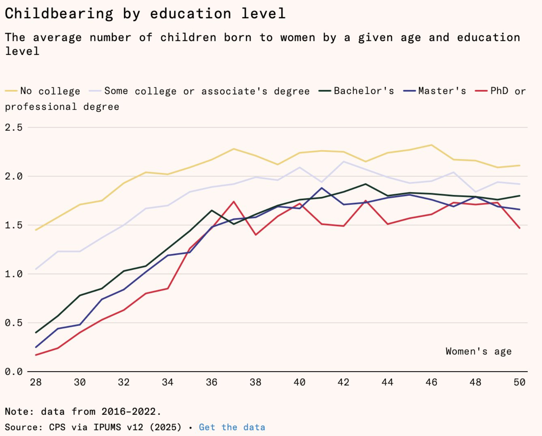 Women know this is how the job market works and act accordingly. As the plot below shows, they often postpone starting a family until they've made significant career progress—a trend especially noticeable among those with PhDs or professional degrees. For example, by age 28, women without a bachelor’s degree typically have between one and one and a half children, while those with higher education average only about 0.25 children. Although highly educated women tend to accelerate childbearing in their thirties to make up for earlier delays, overall fertility rates tend to level off around age 39, resulting in fewer children on average for this group despite their efforts to catch up. This is because, no matter how much the highly educated group wants to catch up, biology gets in the way. I am not going to rehash here the decline in fertility with age — it’s all detailed in the article.