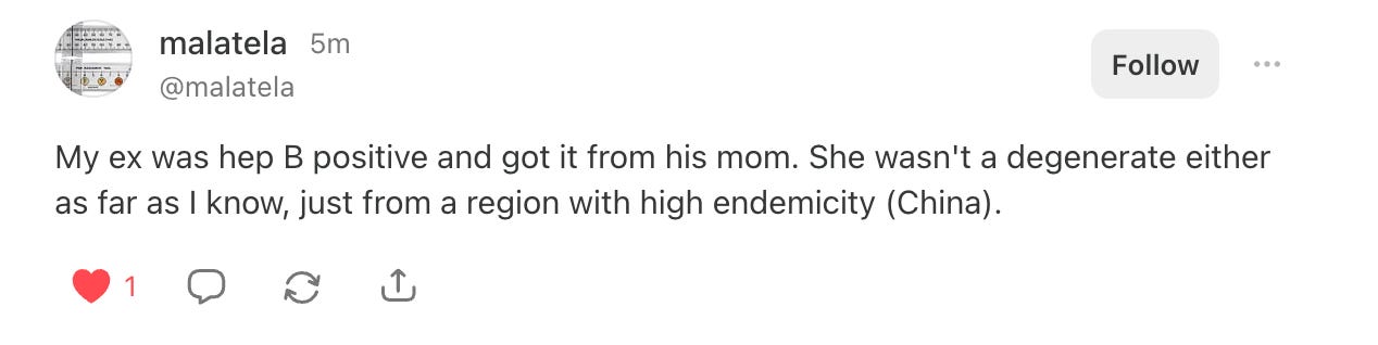 Edit: It was claimed that an initial version of this post was misleading people into thinking that Hepatitis B is more transmissible than it is. You can see the back and forth here. I have amended my article to make sure that no misunderstanding might take place. All in all, the premise on X was that this was as hard to transmit as HIV, which is not true. Hepatitis B is a virus that transmits via bodily fluids and is much more likely to affect “at risk” populations that engage in risky behaviour. Nonetheless, it is considered one of the most contagious viruses in its class and, as I show below, can affect ~ large parts of non at risk people.