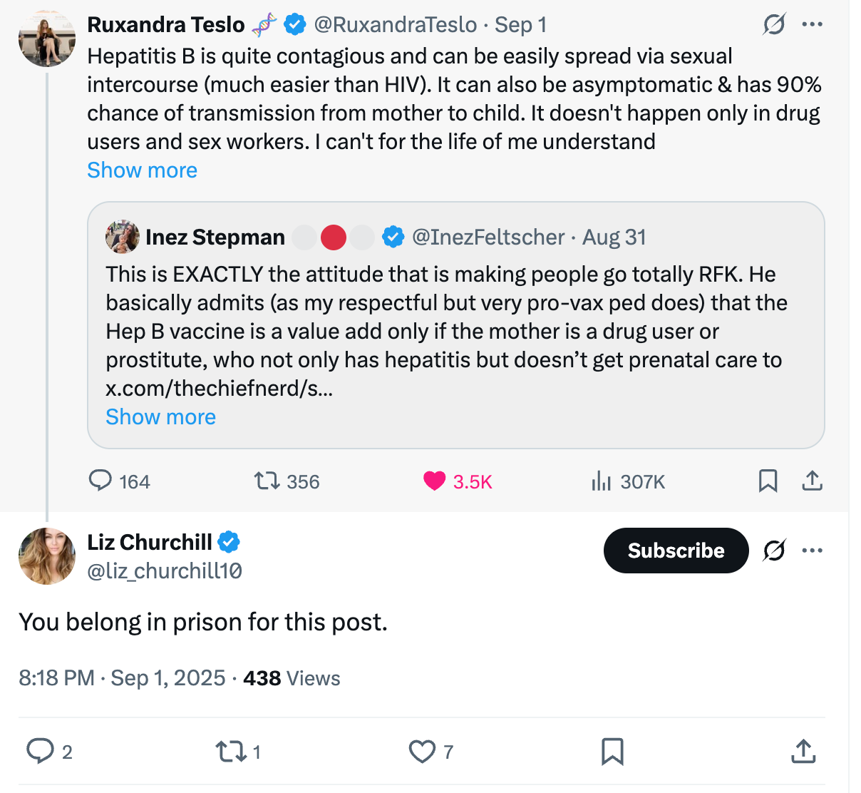 I recently wrote an article about how the universal newborn vaccination policy for Hepatitis B did not originate, as many of its critics claim, out of a desire to not offend liberal sensibilities and that if Hepatitis B became more widespread due to low vaccination, it could end up affecting people beyond those they call “degenerates”. Now, to be clear, I do not think the children (!) of these so-called “degenerates” deserve to get chronic liver issues because of their parents’ actions (what happened to the whole “luxury beliefs”/Christian morality thing?), but since this was framed explicitly as a matter of responsibility of said “degenerate” parents, I felt like I had to clarify that even assuming one does not care about these children, the disease could end up affecting a larger proportion of the population IF it starts being more common in these groups of people.