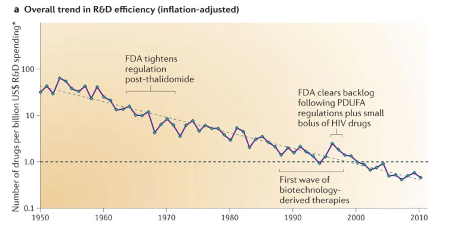I wonder whether the first plot depicting Eroom's Law actually tells us much. Is the number of new drugs the correct numerator? Suppose we invented a single drug that cured cancer; by that measure, R&D efficiency would plummet. Of course, if we adjusted for clinical benefit (in QALYs, perhaps?) per new drug, perhaps it would show an even more disturbing drop in R&D efficiency. But that's the sort of evidence that would convince me that things are as bad as people say. Furthermore, measuring trends in clinical benefit would probably be quite hard, precisely because clinical benefit, like drug profit, is fat-tailed. Just as Taleb showed that the fat-tailed distribution of war casualties makes it hard to infer whether the world has become less violent over time, I would expect that the fat-tailed distribution of drug profits would make it hard to have tight confidence intervals around an estimate of R&D efficiency over time.