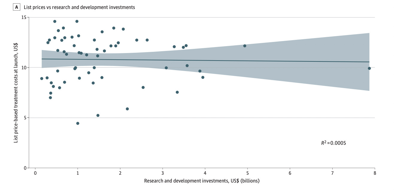 Drug companies frequently claim that high prices are needed to recoup spending on research and development. If high research and development costs justified high drug prices, then an association between these 2 measures would be expected.
