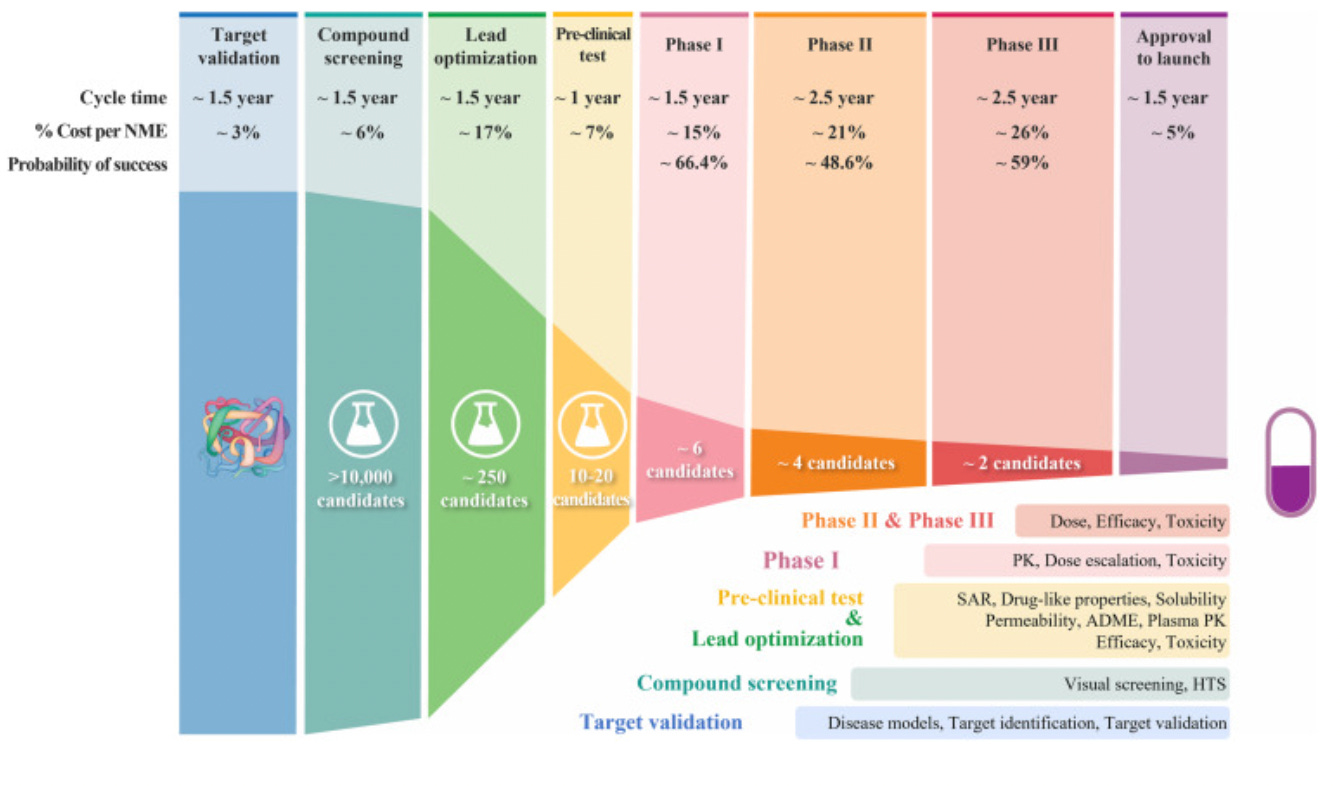 Pharma has a high failure rate. Below is a simplified diagram of the drug discovery process: a long and arduous process. About 10,000 candidates are tested in compound screening for one successful drug launch. Even if we restrict ourselves to compounds involved clinical trials: only about 10% succeed.