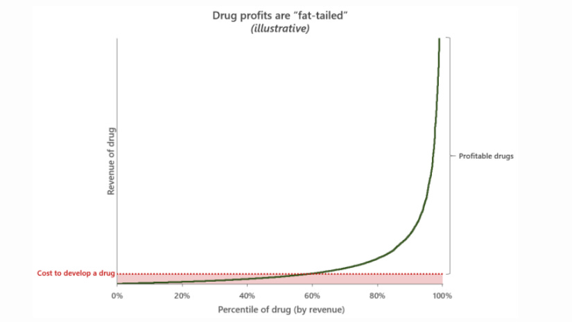 The process of drug discovery and the failure rate at each step Even among drugs that succeed, only a minority actually drive profits. Below I am using this illustration from his excellent blog post about drug pricing to make my point. Alex Telford, an excellent blogger and biopharma analyst makes an excellent point regarding how drug prices. Drug profits are a so-called hits driven business: a few blockbusters make up for the rest of relatively unprofitable drugs and drive further R&D investment.