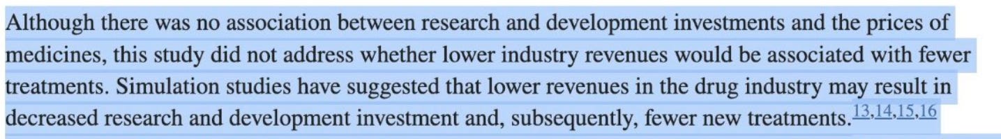 So the correct question here would be: What happens to the pharma R&D budget to be invested in pursuing their entire portfolio if revenues decrease? Funnily enough, the authors themselves realise this is relevant, but choose to bury this in the Conclusion section of the paper, as an afterthought: