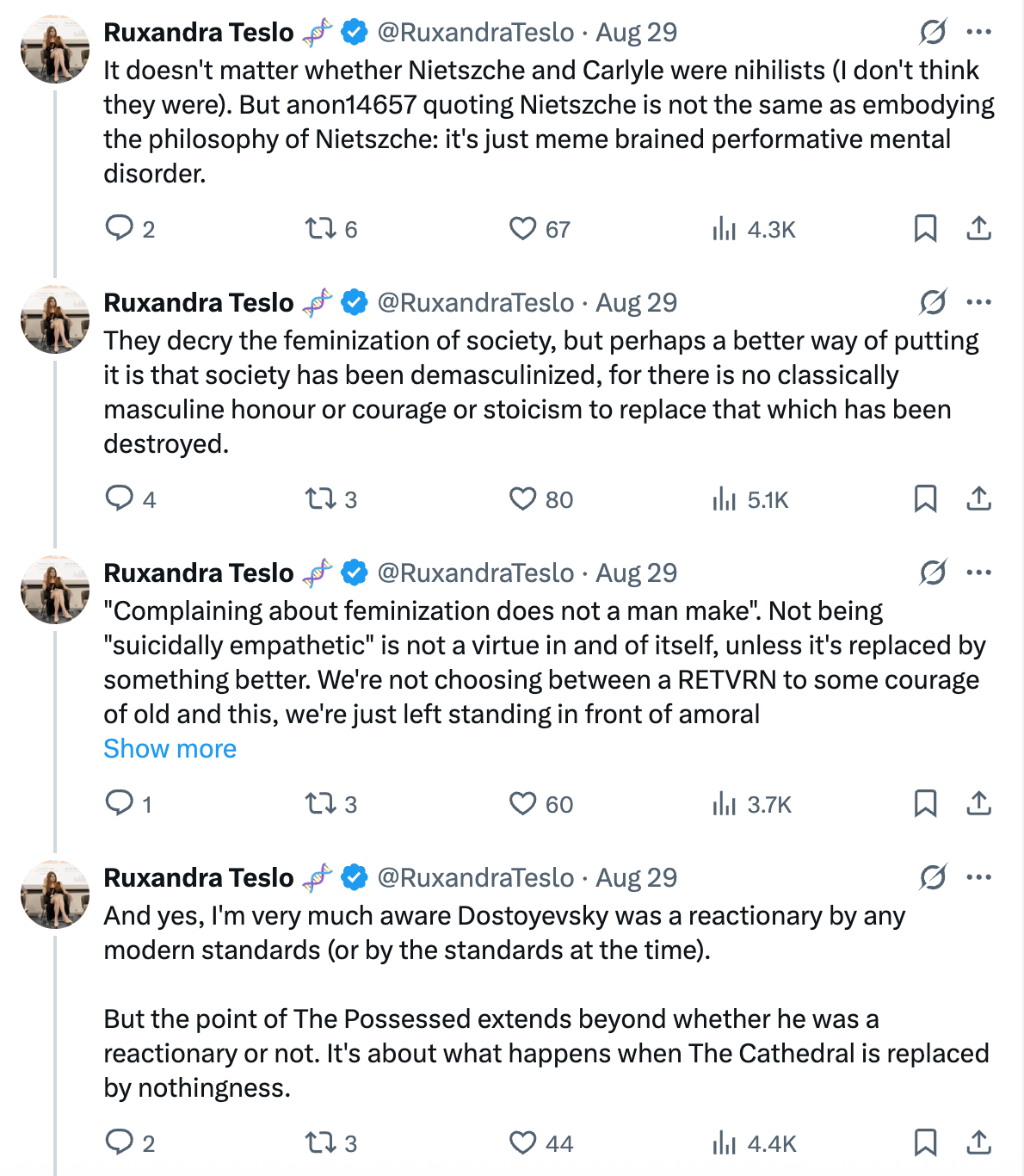In Dostoyevsky’s The Possessed, a group of young radicals embrace destruction as an end in itself: “We shall burn everything, we shall destroy everything, we shall let the cry resound: From the ashes we shall build!” But there is no building that follows, only smoke and ruin. In a recent debate with Curtis Yarvin, I argued that his ideology has seeded the same type of nihilism: destroying The Cathedral is not enough. Among rising rates of mental health issues in the youth and a general sense of ennui and lack of purpose that I can sense in my generation, a constructive path forward that avoids devolving into Third Worldism must be carved: a reinvigoration of classical liberalism, I hope.