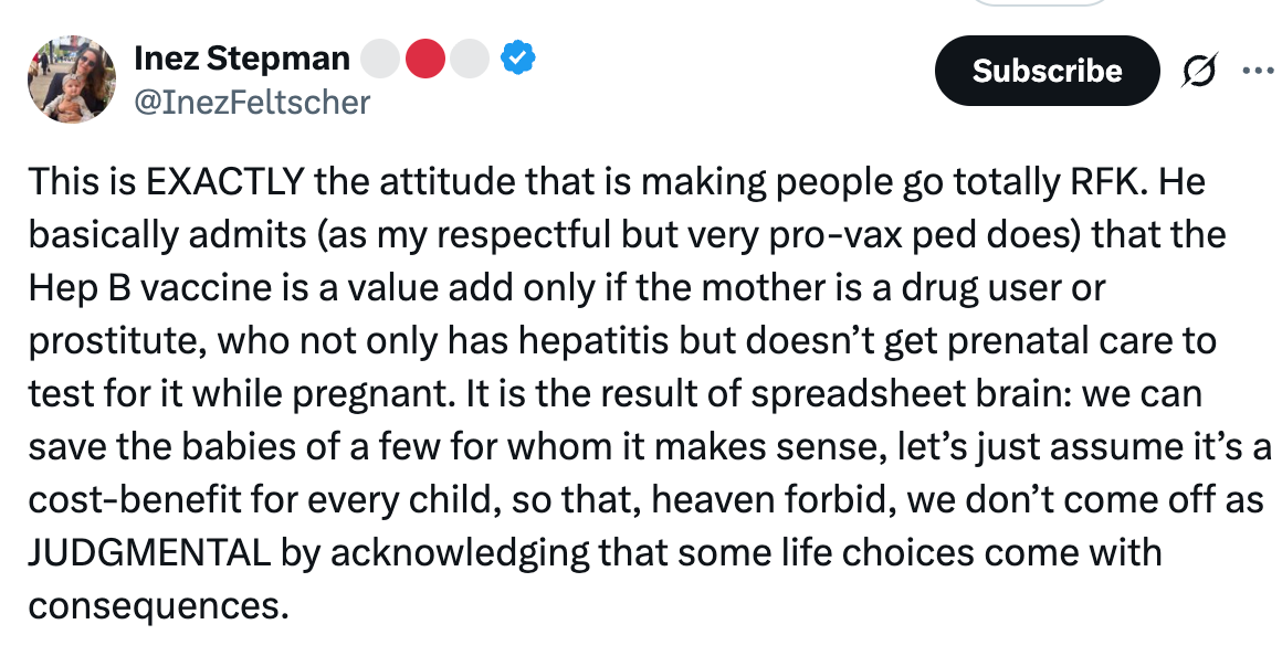 Overall, if something ain’t broke, don’t fix it. If someone has a concrete policy proposal, that takes into account all the caveats of changing what we know has massively reduced liver cancer in children and protects everyone from possible endemicity, they should write up a detailed memo, instead of screaming about degeneracy on X or justifying broad anti-vaxx sentiments.