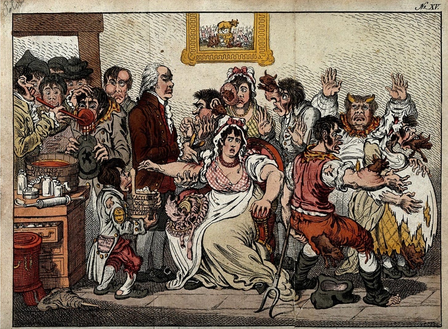 When Edward Jenner introduced the first smallpox vaccine in 1796, he faced widespread resistance. His method involved inoculating people with material from cowpox lesions, and detractors spread rumours that those who received the vaccine would literally turn into cows or grow bovine features. The reluctance to get vaccinated from people of the day is caricatured in drawings like the one below.