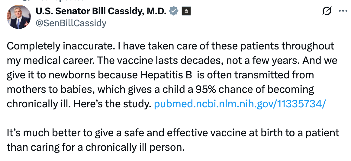 The United States initially tried risk-based approaches, but experience showed that relying on maternal testing and selective prophylaxis left too many babies unprotected. In 1991, the Advisory Committee on Immunization Practices (ACIP) issued its first recommendation for universal hepatitis B vaccination of all infants. In 2005, ACIP went further, recommending that every medically stable newborn receive a hepatitis B vaccine dose within 24 hours of birth, regardless of maternal status. Basically, it was concluded that it was just easier to recommend universal vaccination for everyone. That this is not the result of some refusal to condemn “degeneracy” is clearly showcased by the fact that the 1991 recommendations were supported by both parties with George W Bush Sr for example being very pro-immunization. I am pretty sure Republicans are not a party that has historically been afraid to judge “degeneracy”; on the other hand, pretty much everyone whom I consider a decent human being would agree that it’s better for children to not get liver cancer, regardless of what their parents did. Senator Bill Cassidy himself, a Republican and liver doctor, and someone who has taken socially conservative stances throughout his career, finally declared himself against this entire anti-vaxx non-sense: